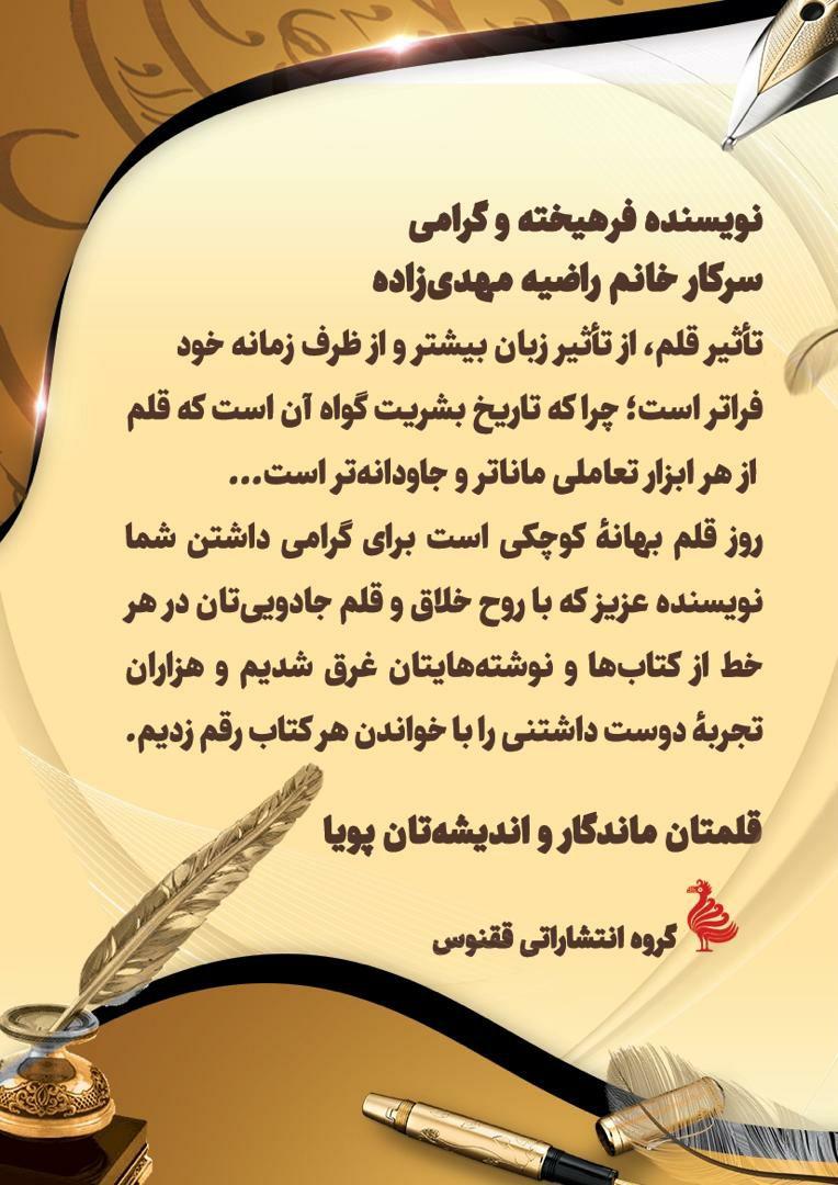 پاییر که شد، گلبرگهای خشک شدهی شمعدانی را توی پاکت نامه کنار پروانهها ریخت. حالا نامهها بوی گلهای شمعدانی میدادند و دستهای زن دایی طاهره هم بوی بهارنارنج.